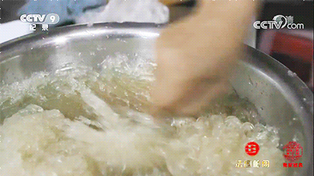 1 |/ B- ^: I8 ^! q* n4 V: V把熬出来的胶液倒入大盆放凉后 放进冰箱冷藏待冷却凝固成型 用石花刨 麻利的把石花刮成均匀的细条盛在碗里
