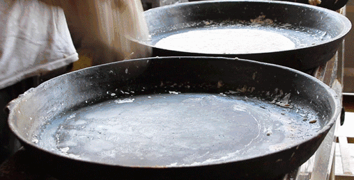 每年四五月,惠安女采集石花草,清洗掉海盐和海蛎壳,经过晾晒,石花草便能下锅熬制石花膏了。一份石花膏,需要经过四五小时的熬煮、过滤,再经过12小时的天然凝固。正宗的石花膏,颜色偏黄,不同于用果冻粉煮出的味道。 . X K3 G! h; |# X- R2 o4 V